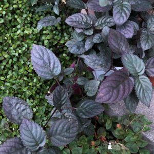 ヘミグラフィス・アルテルナータ 台風避難で玄関先に。ワイヤープランツや ポリゴナムの上から垂れた カラーリーフがキレイ✨✨ 先日黒ポット苗このボリュームで ¥100に値下げされてた🪴 室内冬越しチームにもこの色は嬉しい🥰 途中からたくさん気根出してるから ✂️して増やせるかな😊