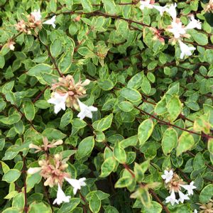 アベリア ホープレイズ レモンイエローの斑入り葉に白花がキレイ🌿🌿 ヤマボウシの下なので日陰になりますが たくさん咲いてくれました💕 🏷白い水曜日