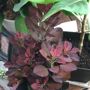 スモークツリーパープレア 花後にニョキニョキ伸び出した新梢 属名電気虫の被害もあちこちに🐛 隣家の雨樋にもかかっていたし 台風が近づいている事もあり 残念だけどカット✂️しました🥲 捨てるのも忍びなく花瓶に挿して 少しの間、綺麗な葉色を楽しみます😊 美容室でカット✂️した枝を頂いて 挿木したフィカスアルテシマも顔見せ🪴