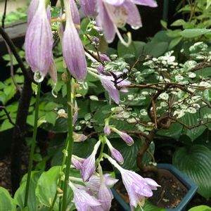 雨上がりの庭③ ギホウシゴールデンティアラ 雨に打たれてかわいそうだけど なかなか綺麗な景色 後のニレ欅斑入り(アキニレケヤキ)も ちょっといい感じです💕