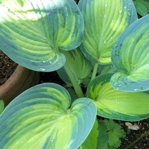 ホスタ(ギボウシ)ジューン 雨上がり朝日に輝いてキレイ💕 今年は虫に食べられてない💦