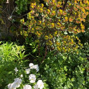 ユーホルビアブラックバードの花?苞? バレーボール大に育った😅 ビオラの株と比較すると良くわかる💦