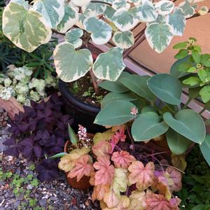 ヒューケラ斑入り オキザリス紫の舞 暑くなって来ましたね〜🥵 ここは家の北側通路の花壇です🪴 斑入りの葉っぱ🍃で涼しげに🍃