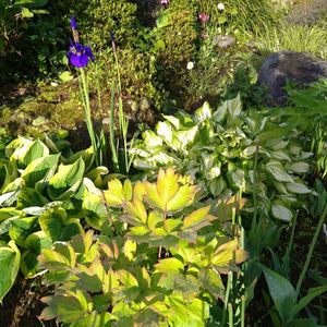 今朝の庭、雨上がりで輝いて特別感がありました✨✨ 斑入りギボウシの葉とボタンの葉の色あいがとてもいい感じで、お気に入りのコーナーです🌿💕🎶