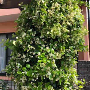 ハツユキカズラ満開 モッコウバラを剪定したら 自転車置き場の柱に絡んだ全体が 良く見えてきました。香りも全開👃