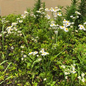 ヒメジュオン 陽の光を受け、病院にある花壇に咲いていた。ハルジオンは葉が茎を抱くらしいので、これはきっとヒメジュオン。