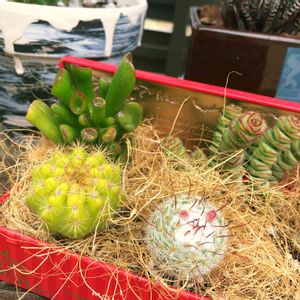 チョコ缶にそのまま植えたやつ🌵✨ モノクロな庭で赤が目立ってる🤣 よく見たら花が咲きそうだぁ🌵✨✨✨