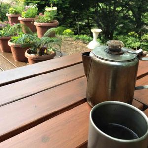 昨日 お化粧直ししたウッドデッキと妻の鉢植え見ながらモーニングコーヒー☕️