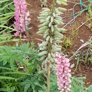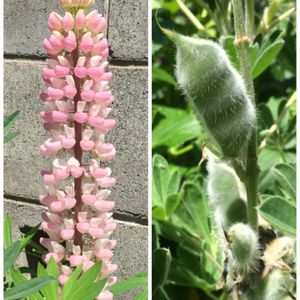 ピンクのルピナスが咲きました💕 まさか うちの庭にこんな立派なお花が咲くなんて :( ;´꒳`;): 右は先日🆙した紫の傘葉ルピナスの種です😁 モケモケの枝豆みたいです😂