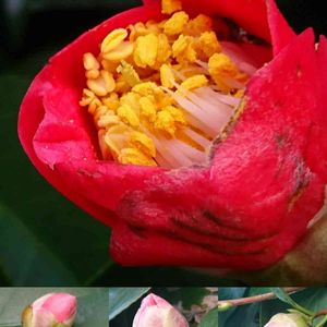椿 🌼✨ 最近、色づきつつある我が家の椿の蕾を、 朝夕にチェックするのが日課の1つになってましたが…… やられた~ッ(;>_<;)💦 ……て感じです💧 一番花🌼を見逃してしまいました💦 既に上の方や奥の方に開いてる子たちが……😅 足場が悪いとこな上に、日当たりがいい面の側が崖になってるので、 どうしても目が届きにくいんですよね~😰 pic も、これが精一杯…… 程よい位置の花が咲いてくれたら、またじっくり見たいと思います😆