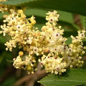 ニワトコ(庭常、接骨木) ガマズミ科 ニワトコ属 3~5月 3~6m 在来種 落葉低木~小高木 子房下位 葉は対生 奇数羽状複葉で長さ8~30cm 小葉は長さ3~10cm、幅1~4cmの長楕円形で、先は鋭くとがる 基部は円形~くさび形、葉縁には細かい鋸歯がある 小葉は花のつく枝では2~3対、花のつかない枝では3~6対 花は新枝の先につく円錐花序に多数 花冠は直径2~3mm 淡黄白色(~ときに帯淡紫色) 5深裂し裂片は反り返る 雄しべ5個 雌しべ1個∶柱頭3裂(暗紫色) 果実は核果 長さ3~5㎜の卵球形で暗赤色に熟す ※ 葉柄基部に花外蜜腺があるそうです(知らなかった💦) 画像を調べたところ、これかな?というものがありました(画像5枚目)
