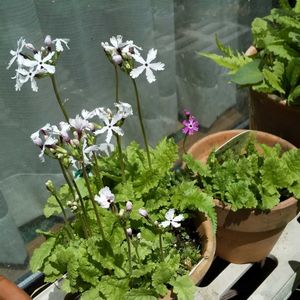 我が家のニホンサクラソウ(日本桜草)エリア❇️❇️🌸❇️🌸❇️🌸❇️❇️ ①ショッキングピンクのお日本桜草❇️💗💗💗❇️ ②吹雪笠❇️🤍🤍❇️ 北斗星❇️🌸💮❇️ 白トンボ❇️🤍💮❇️ ③フウチソウ(風知草)の鉢植えの中にも💕