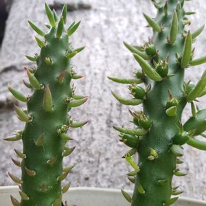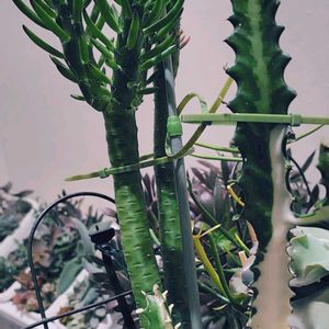 夏に根元が腐ってしまった何年ものかの姫将軍、ポロリと折れてしまいました。 上の方の大丈夫そうなところをカットしてみようかと、横の空いてた鉢にとりあえずポイっとしてそのまま忘れてました😅 いつの間にか、そのまま横になった姿て根づいてしまいました。 もう、持ち上げようとしてもビクともしません。 すごい生命力です。