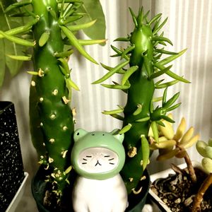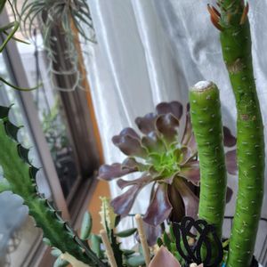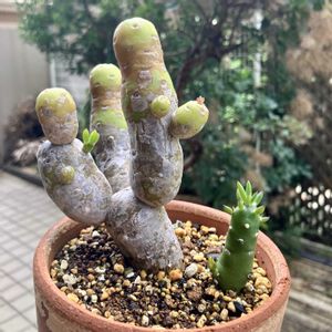 ホワイトゴースト(8/8📷)と、姫将軍を寄せました。ノッポは、植え替えるとグラつくので、大変💦姫将軍側面に穴が空いていたので、植え替え時に、✂️してみましたが虫は発見できず。 姫将軍って多頭になるのかな?これからの展開が楽しみです。(側面のイボが削げ落ち、現在こんな姿。日光不足かな?)