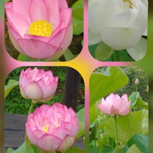 蓮池には花がほとんどなく🌺🌱大きな葉っぱばかりで、残念でした 🌺左 明光蓮 右 太白蓮、 🌺左下 誠 右下 蓮池内で名前分からず 色は白かピンクのみ 大庭ハスは終わってました 和歌山緑化センター蓮池より