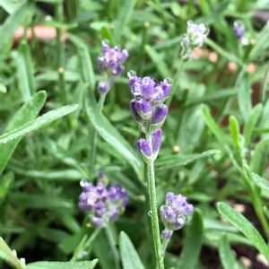 イングリッシュラベンダー💜 🌿 昨日は酷い土砂降りだったそうです☔️ 仕事で全く気がつきませんでした😧 今朝は小雨、肌寒いです☂️ 花穂の切り取りをしてから6日経って 少しだけ花が立ち上がってきました 雨粒が乗っておしゃれしているみたい🤗