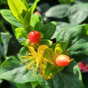今日のお花 ❤️ヒぺリカム❤️ 初夏に黄色のお花が咲きますが、赤い艶々した実も可愛い💚 撮影:お蔵から👀📷️✨