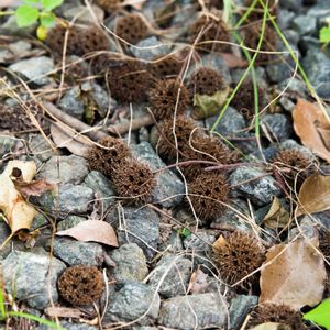 私が「真っ黒クロスケ」と呼んでいる「モミジバフウ(紅葉葉楓)」の実を見つけ〜と思いましたが、よく見るとちょっと違うかなぁ〜🧐 トゲトゲの形状がちょっと優しい感じです。 どうもこれは「タイワンフウ(台湾楓)」のようですネ。😚 どちらもフウ科フウ属、よく似た姿形ですネ。😊