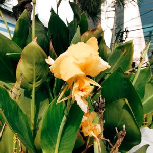 10/16㈰③ カンナ ベンガルタイガー 斑入り葉が涼し気です😄💚💚 小雨に濡れた花も風情がありますね🧡 一昨年、平塚花菜ガーデンで撮りました!