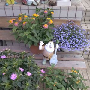 植え替え待ちの鉢花達 出番がないの?と白雪姫👸🏻と七人(4人)の小人達。だいぶ塗装がはげて私と同様疲れてます💀 ベンチも塗り替えようと庭から持ってきたが、手付かずのまま。