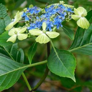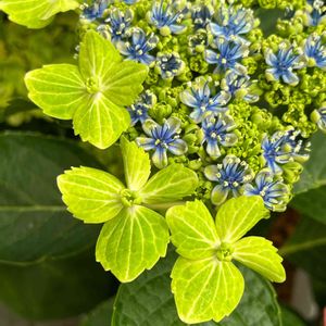 公園開催の「山野草展」で出会い… 一目惚れです😍💘 ガクアジサイ「大島緑花」💚💙 伊豆大島で発見されました。 白筋が入る緑色の装飾花と濃青の真花との コントラストが美しすぎます!(*⁰▿⁰*)💕 帰宅後、すぐにネットから苗を取り寄せ 実家の母にお願いして育てて貰っています まだ小さな株ですが来年はお花が見れると イイなぁ‼︎🙏💚💙