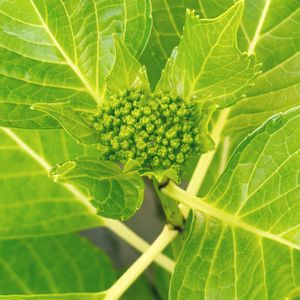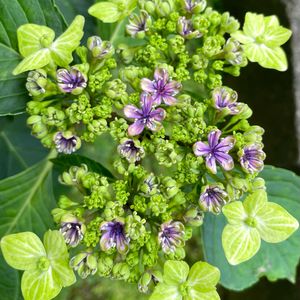 これは、ガクアジサイのオオシマリョクカ(大島緑花)です。 伊豆大島で発見され、装飾花が白筋の入る黄緑色のアジサイです🌼 複雑な色合いになるのが人気の秘密✨だそうです😃