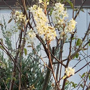 夕陽にジューンベリーが白く光ってます 今日は、一人 バラの植え替え 草むしり まだ風が少し冷たかったです