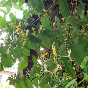 スイカズラ やさしい色で咲いてます 西側の窓の外 下から見上げました 切っても切っても、分厚い西陽よけになってくれてます 昨日、2階から見たら上側はもっと花がたくさんさいてました ・・やっぱり花を咲かせるなら、陽当たりのいい方がいいよね