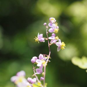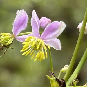 シキンカラマツ。 初めて出会った花。植物園も隅から隅まで歩いていないと、気づかない花があるのですよね。 シキンカラマツ(紫錦唐松)は、 キンポウゲ科カラマツソウ属の多年草。この和名の由来は、カラマツソウの仲間で、萼が紫色、葯が金色(黄色)からきているそうです。 2枚目以降は携帯カメラpic。 3枚目は自動で切り取られているけど、雰囲気が分かるかな・・。とても小さな花です。