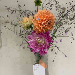 【花束】夏休みの1日お花屋さん体験で、近所の一年生の子が束ねてくれた花束❤️ シキンカラマツという初めてのお花がとってもかわいい😍