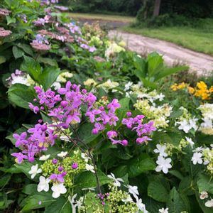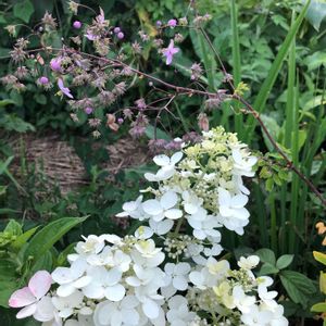 ピラミッド紫陽花の側で シキンカラマツが咲いています 小さなピンクのお花は とても可愛い💕です 花が終わりに近づいて 上手く種が取れると嬉しいけど あまり種取りをしたことがない ちょっと時期を見るのが不安ですね😅