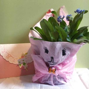 先ほどいただいた薔薇のお礼にと忘れな草の苗を持って行きました。 幼稚園生の娘が考えた『ウサギさん包み』 たまたまこうなったので、また同じ包み方はできないと思うけど…。 子供らしくて可愛いです♡ お手紙は、娘がたまたま数日前に「いつもおはなをくれてありがとうございます。うれしいです。」って書いていたのでそちらも添えて。