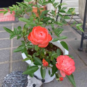 おはようございます☁️ 時折パラパラと雨が降る天気です。 最近は雨がちなので、あまり庭には出ていなくて…( ˊᵕˋ ;)💦 早く、すっきりと晴れた天気になって欲しいです😅 今日の投稿picは、ミニ薔薇。 お連れした時には、どんな色の花が咲くか分からなかったのですが、咲いてみたらオレンジ🧡あまり無い色なんでテンションが上がったのを覚えています(∩´∀`∩)💕 前回投稿したのは、6月1日。(過去の投稿は、写真の中のタグから見れます) ミニ薔薇さんは、場所を取らないし、手入れも楽なので、玄関前の軒下にずらりと並べてるので、玄関の出入りで1番目に入り、楽しみだったりします(*´˘`*)♥ スイートチャリオットさんも咲き始めたので、楽しみです。