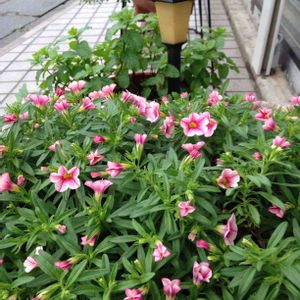 おはようございます☀ 今日はお天気が良くなりました😊 店前の花達です🌸🌿 スペアミント、ミニカリブラコア、タイム、切り戻ししたアメリカンブルー、隠れているのがセンニチコウ、その奥が根が出て挿したアメリカンブルー、アイビーです🤗