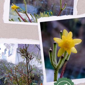 ①〰️④ ソフォラリトルベイビー 少し前にあ〰️今年も咲いた〰️( ᐛ👐🏼)って思ってたら 満開になってるじゃん🎶お花が小さくてパシャで分かりにくいんだけど こんなに沢山咲いたのは初めて。沢山の黄色い小鳥がピーチクパーチクしているように見えるんだ。このベイベちゃん ジグザグの木、成熟するとお花が咲くって。今 樹高1mくらい。 玄関周りのウエルカムツリー🌳 ⑤猿恋葦。何年か前(22.9.27投稿)ダイソーで見つけた小さい苗が 随分立派になって 少しだけど花を付けてくれた。黄花繋がり〰️🌼*・