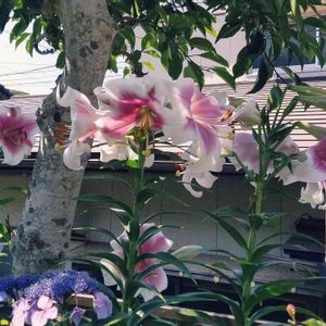 庭のカサブランカが満開になりました💮アチャコチャ向いてカメラ目線に撮れません💦 蕾が、まだまだあるので、にぎやかになりそうです🎶