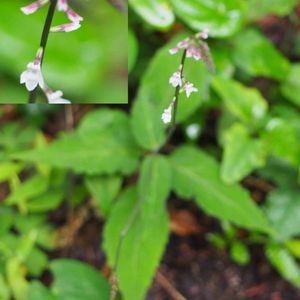 ナガバハエドクソウ(長葉蝿毒草) 石段の隙間からちらちら可愛い小花♪ ミズヒキに雰囲気の似たハエドクソウの一種です🌱 細長く伸びた花枝に穂状についた白×紅色の花はツボミは上向き、花は横→、果実は下向き↓につきます 華奢な見た目とはウラハラに、、株全体が有毒😱☠️ 根を煮詰めた液をハエ取り紙の毒に使ったことからハエ毒草🌿