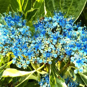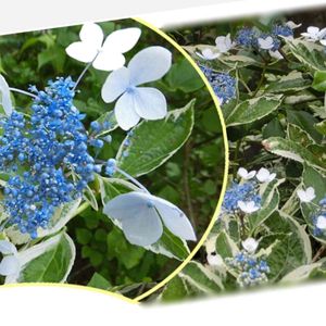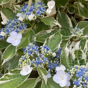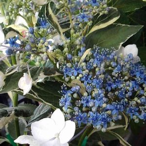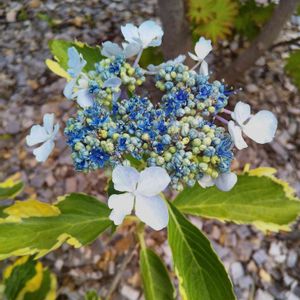 おはようございます😃 斑入りのガクアジサイのブルーが見頃となりました❣️ 去年の剪定は段々に咲いてくれるようにしたけど、今年はうまく仕立てれた地植えのガクアジサイです(^。^)
