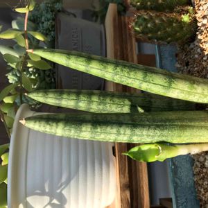 下のヒュンって出てるのが子株、 ほっそいのは花芽ですか??😊 あと、外に出したせいか茶色くなり、葉っぱも垂れてしまい、室内の明るい網戸越しの窓際で養生して2〜3週間くらい経ち、だんだん緑色にはなってきました😅 垂れた葉っぱは持ち上がりますか? 徒長?それとも元気がない?? ご教授していただけると助かります╰(*´︶`*)╯♡