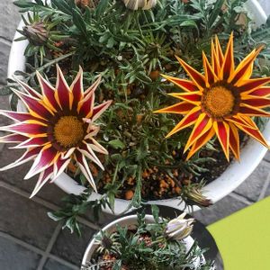 💜ガザニア🌿 暖かな午後☀ 陽射しを浴びて思いきり 花開くガザニア 鉢いっぱい広がっています 𖡼.𖤣💜🤍💛🧡💜🌿𖥧𓈒◌܀𖥧𖧧 ˒˒.