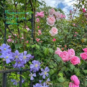 こんばんは🌇 遅咲きのナエマが咲き始めました( ꇐ₃ꇐ ) 中心に見える 薄いピンクの薔薇がナエマです💕 名前を忘れた オーストラリアのクレマチスとの コラボを楽しんでいます💙🩷