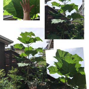 これは珍しいですよ! 桐の幼木です。 大きな向日葵🌻だなぁと思って拝見させて頂いていたら、桐ですよと教えていただき びっくりしました。葉の大きさは50cmはありますよ!この子の幹の太さは8cmほど、太くなったら桐のタンスになるんですかね^ ^