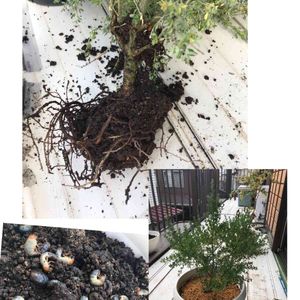 (*⁰▿⁰*) やられました〜 強風でエニシダが鉢からすっぽ抜けてしまいました!強風ですっぽ抜ける??まさか…もう一度鉢に植えなおそうとして鉢の中の土を掘り返すと…中から (*⁰▿⁰*) 調べたらコガネムシの幼虫見たいです こいつが根っこを食べてしまった為すっぽ抜けてしまったみたいです☆彡土を全て取り替えてもう一度植え直したのですが… 頑張ってエニシダちゃん!