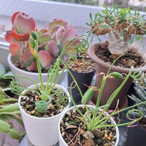 アルブカ咲きました◡̈⃝︎⋆︎* 手前のドリミオプシスマクラータもノーマークのこの子が蕾をつけていて、今日発見しました👀