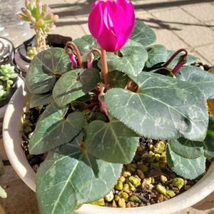 夏越しした2年目のシクラメンがようやく咲きました☀️ 冬の間もずっとつぼみがスタンバイしてましたが、全く動きがありませんでした(-ω- ?) 春に咲くサイクルに変わるのかしら? もうひとつの株の方が夏の間は元気でしたが枯れてしまいました😢