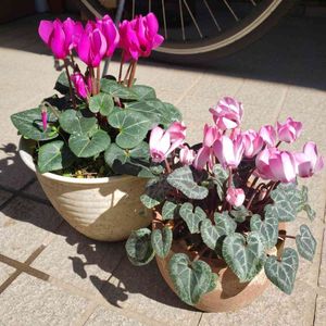 2年目のシクラメン(奥)がいい感じになりました☺️ 手前の芳香シクラメンは暴れ咲き💣 咲きかたに個性があって可愛らしいです🐤💕