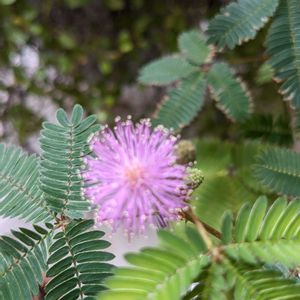 こんにちは☀️🥵 おじぎ草のお花ポツポツ 咲き始めました💕 葉っぱだけでも好きなんですが 思っていた以上にお花が愛らしい🥰