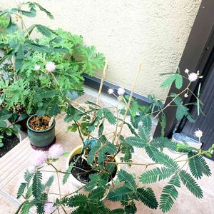 今年5月に購入したおじぎそう❣️ 今朝初めて花が咲いていました🎵 蕾があったのも知らず 突然花開いていたので感動💕