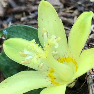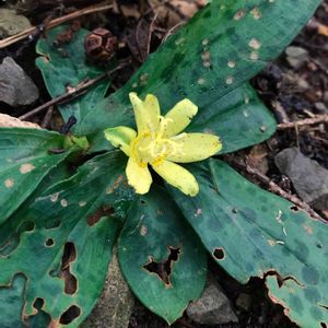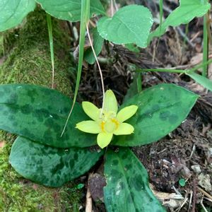 近くの山に車を走らせ、林床をキョロキョロ… 咲いてました、チャボホトトギス☆ 葉っぱがボロボロですね😅 透き通ったレモンイエローが林床に輝いてました✨