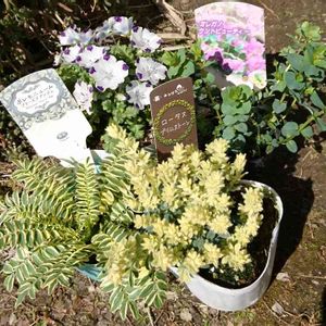 この鉢の再利用で作った寄せ植え。組み合わせが上手くいかずにすごい悩んだ。